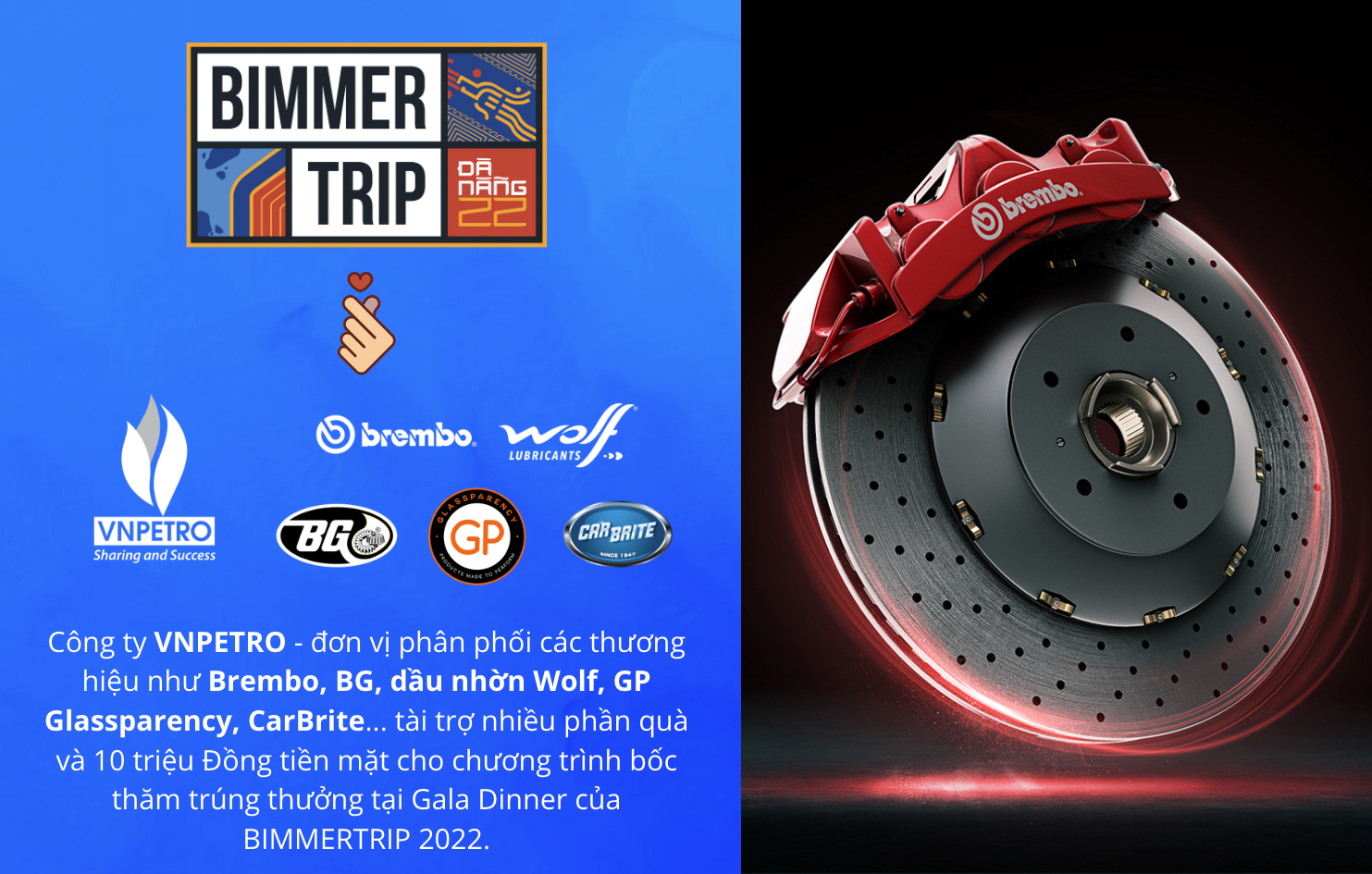 Công ty Cổ phần Đầu tư và Thương mại Hóa dầu Việt Nam (VNPETRO) tài trợ 04 phần quà gồm nhiều phụ kiện dành cho xe hơi (dầu máy, phủ kính lái nano, mùi hương cho xe hơi...) và 10 triệu Đồng tiền mặt cho chương trình bốc thăm trúng thưởng tại Gala Dinner trong sự kiện BIMMERTRIP 2022.