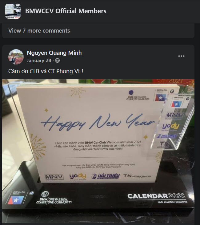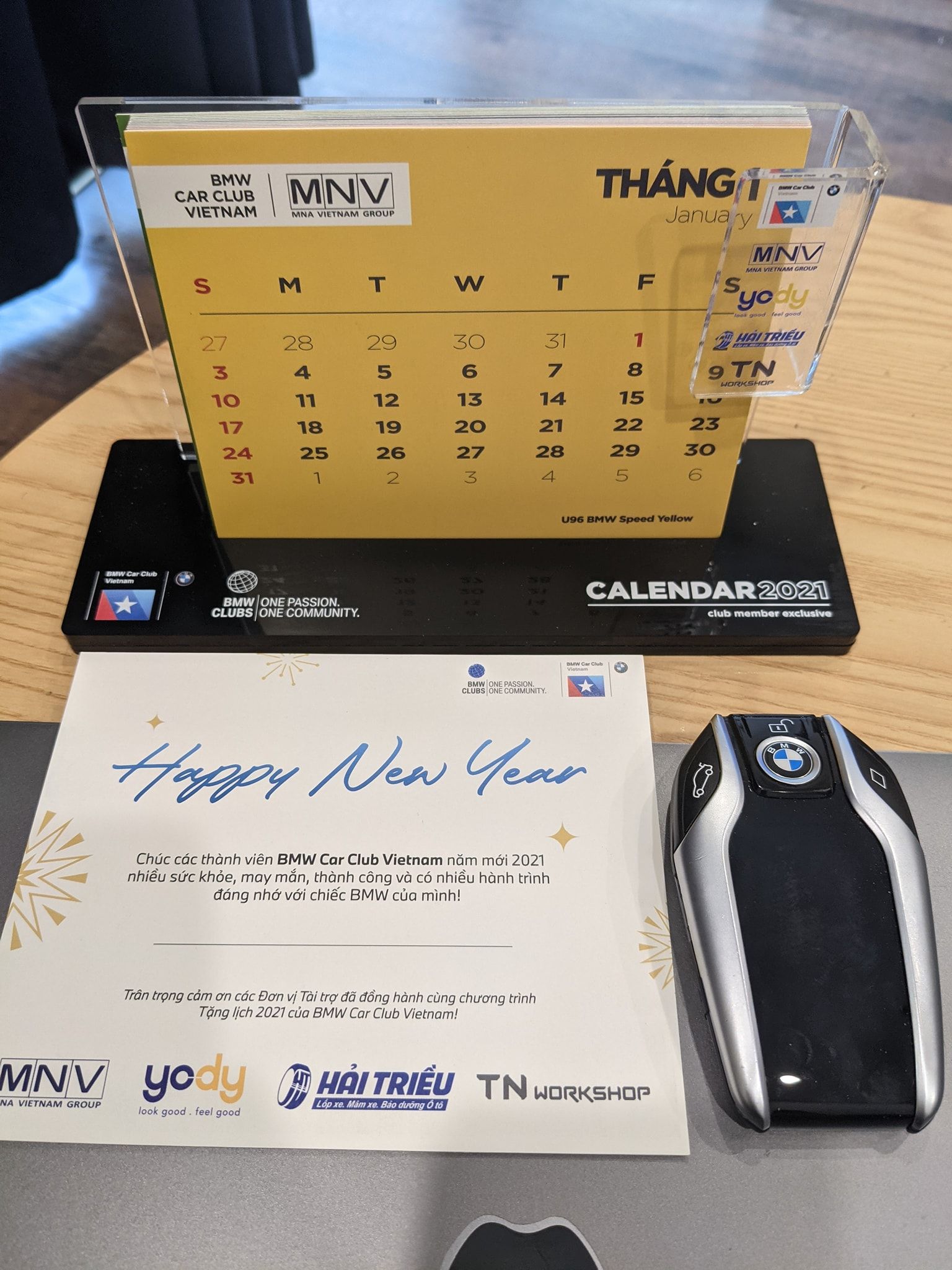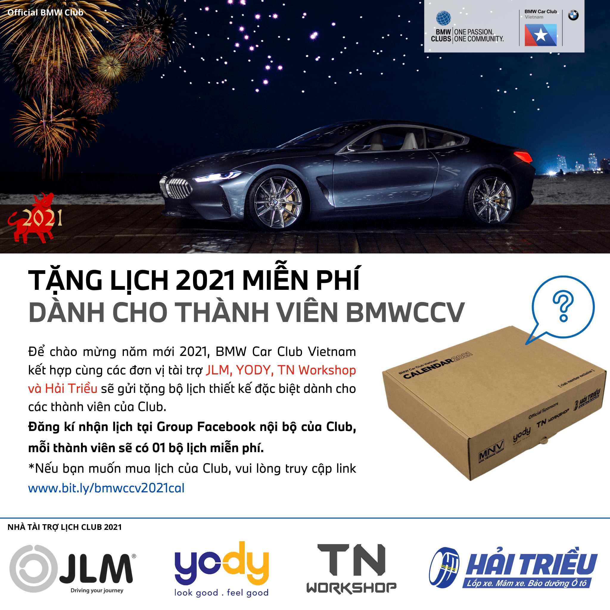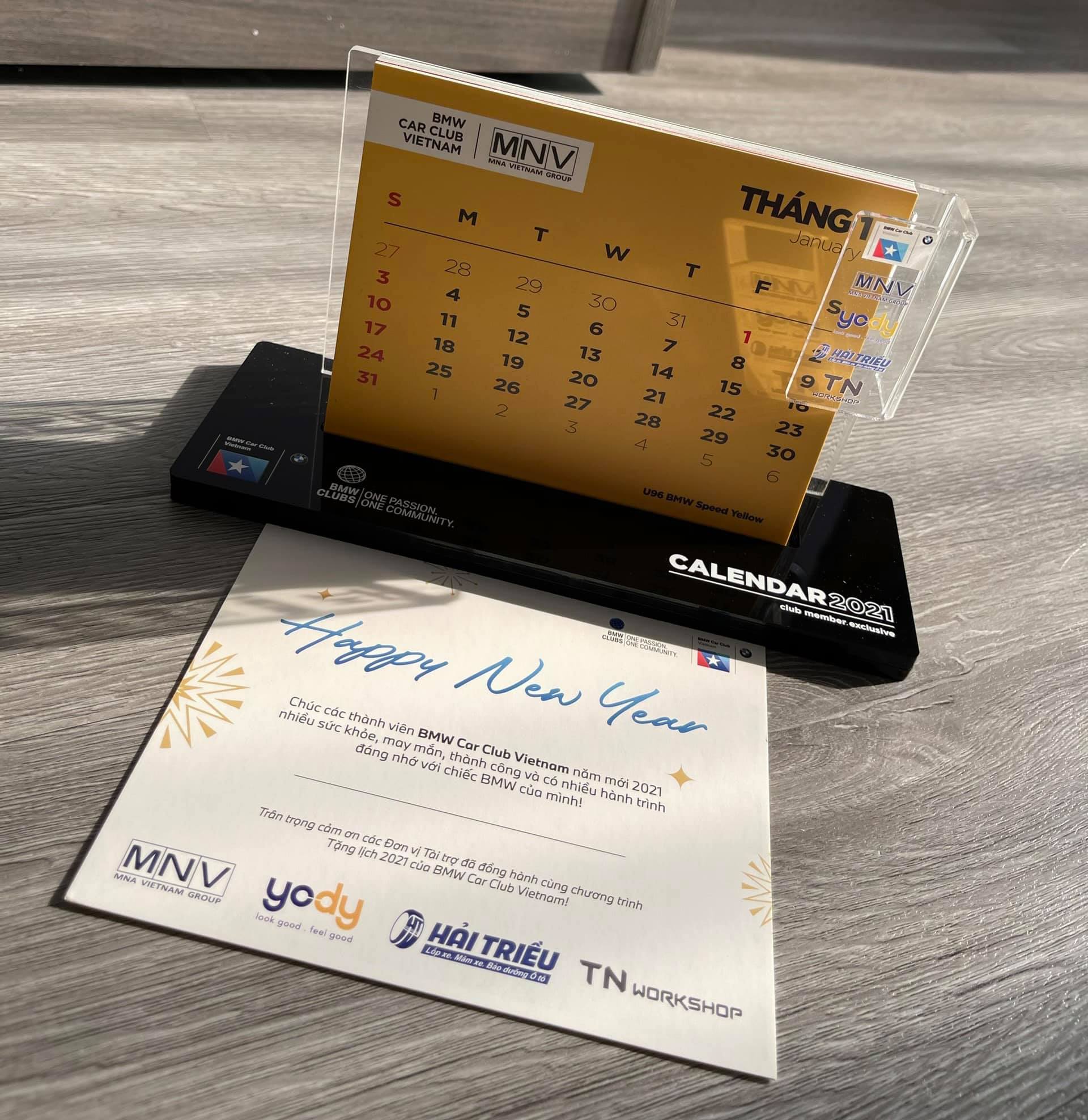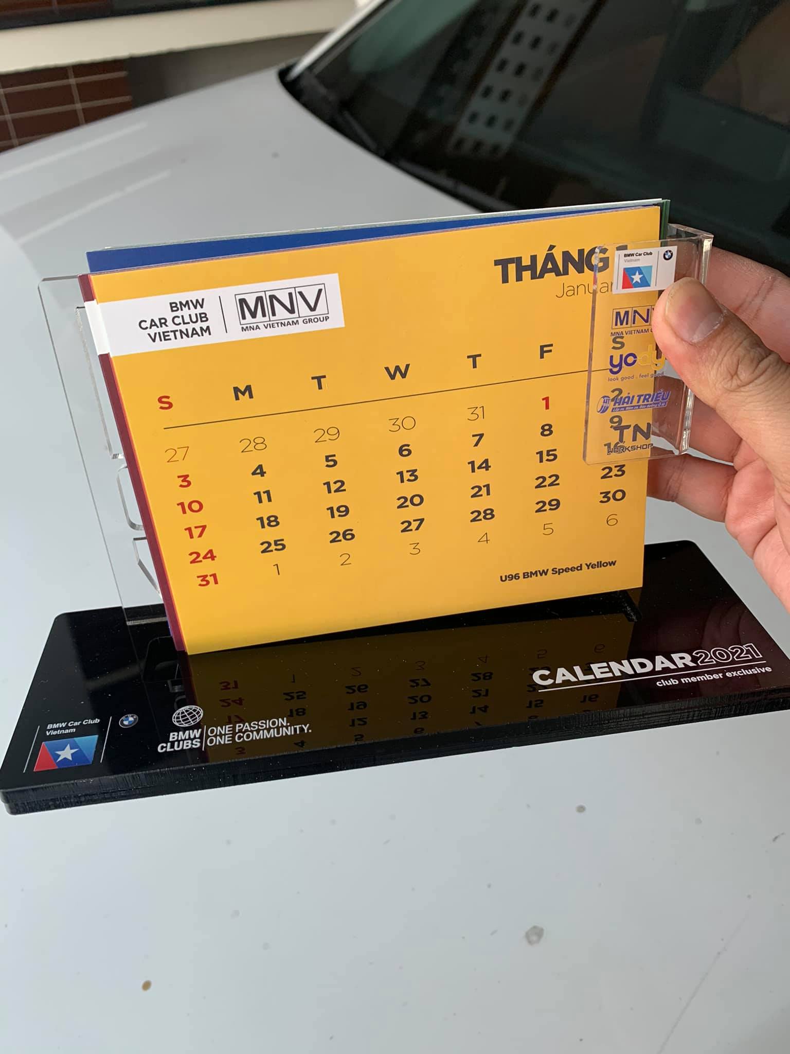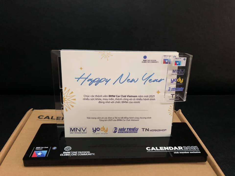 Để chào mừng năm mới 2021, BMW Car Club Vietnam, phối hợp với các đơn vị tài trợ: NMV Vietnam, Hệ thống thời trang YODY, Lốp xe Hải Triều và TN Workshop, trong chương trình tặng lịch miễn phí dành cho thành viên Club.