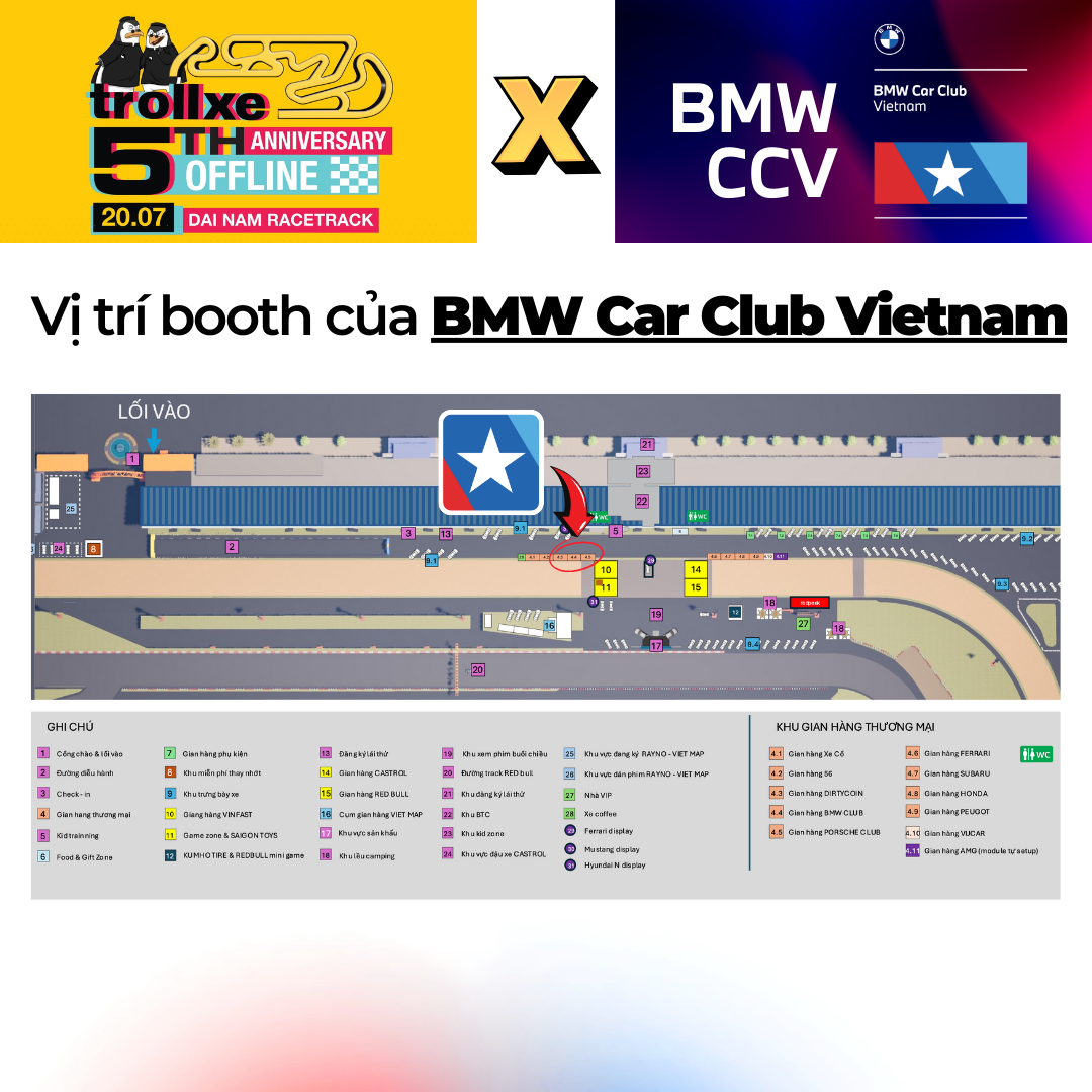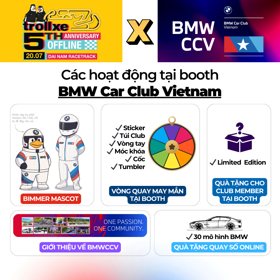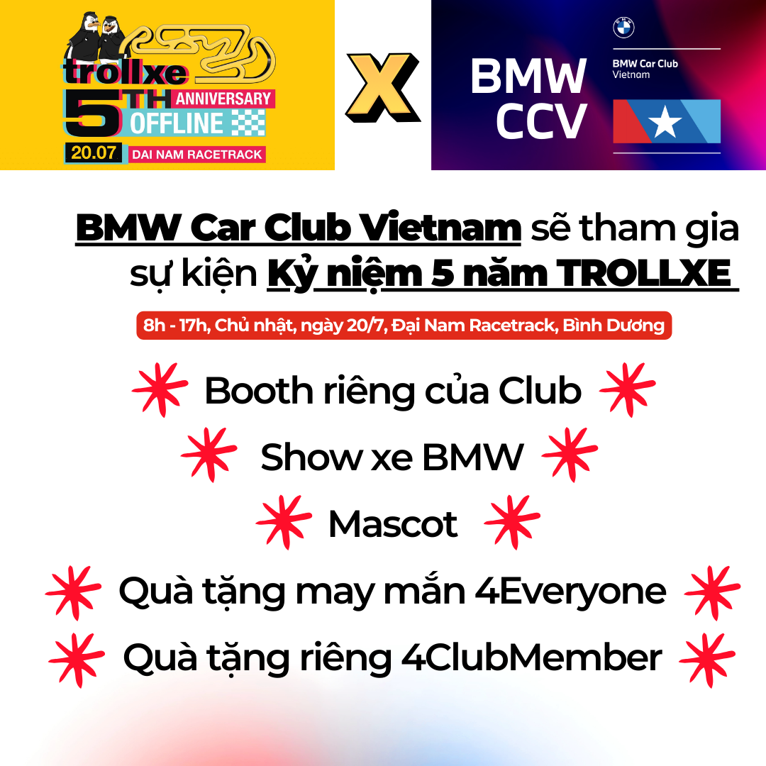 Kính mời các Bimmer và bạn yêu xe ghé thăm Booth của BMW Car Club Vietnam tại sự kiện TROLLXE 5th ANNIVERSARY tại Đại Nam Racetrack, Bình Dương vào ngày 20/7 tới này.