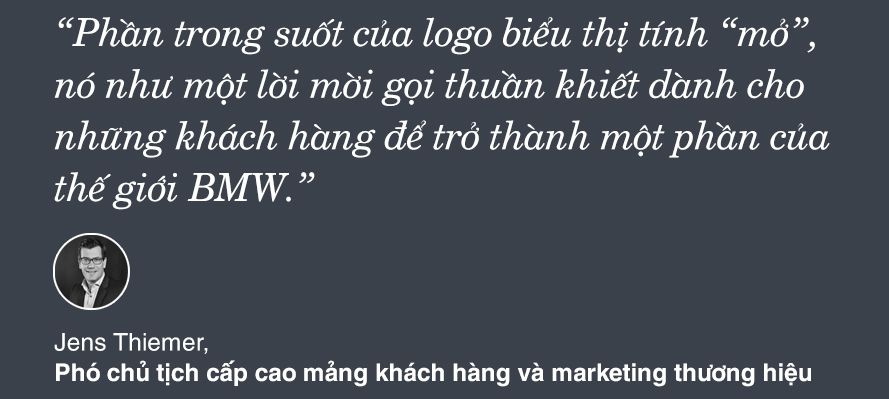 “Phần trong suốt của logo biểu thị tính “mở”, nó như một lời mời gọi thuần khiết dành cho những khách hàng để trở thành một phần của thế giới BMW.“ - ông Jens Thiemer, phó chủ tịch cấp cao mảng khách hàng và marketing thương hiệu, cho biết.
