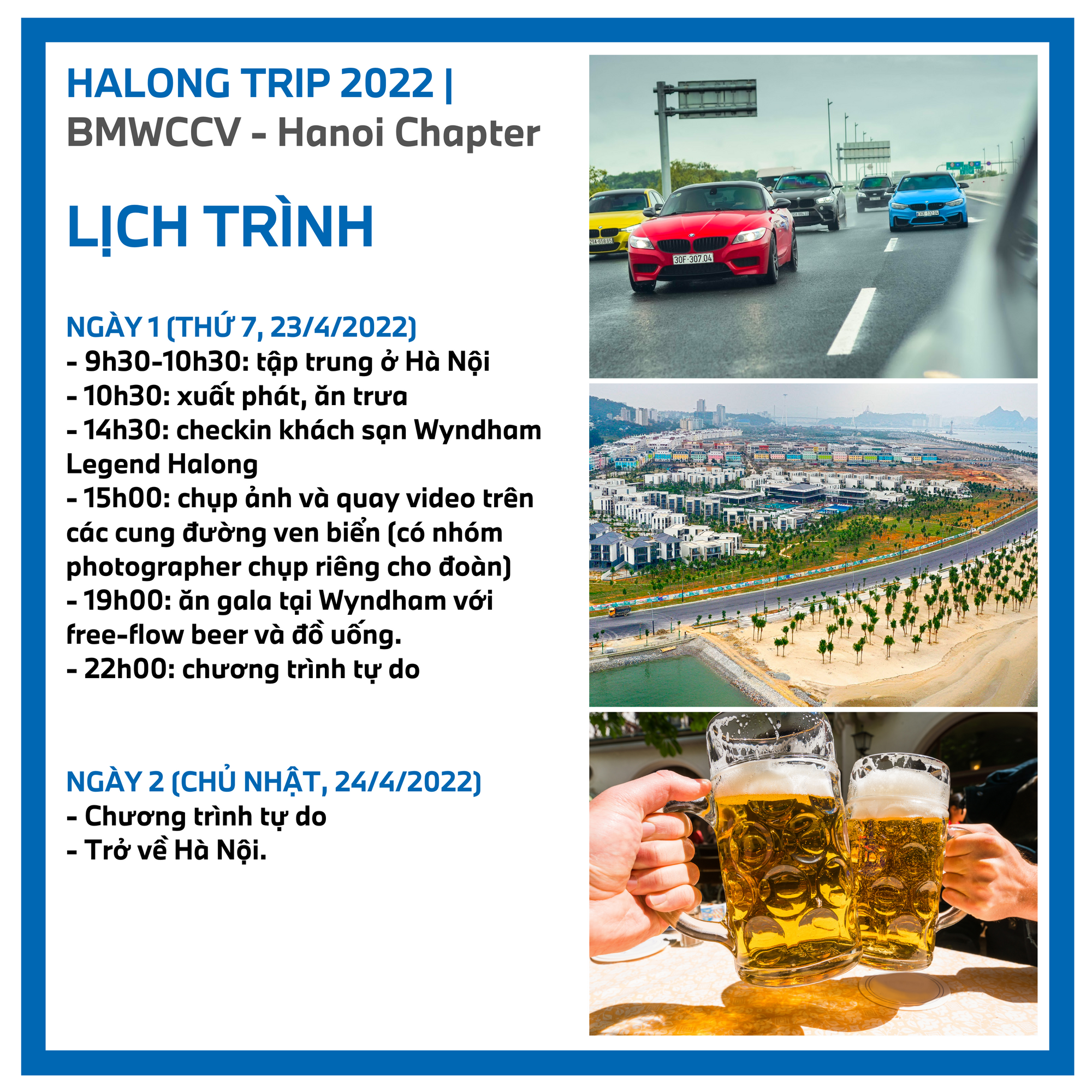 BMW Club of Hanoi sẽ tổ chức chương trình offline HẠ LONG TRIP 2022 với mục đích giao lưu giữa các thành viên, khám phá những cung đường cao tốc tuyêt đẹp cũng như thưởng thức không khí biển tuyệt vời của thành phố Hạ Long.
