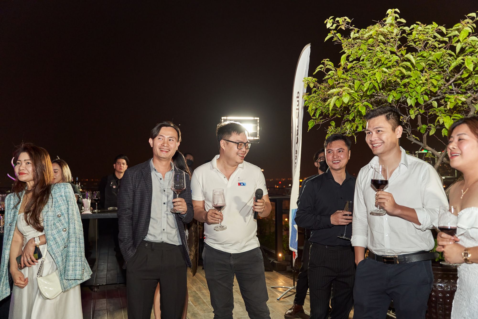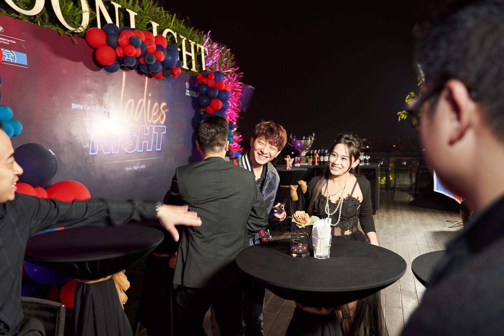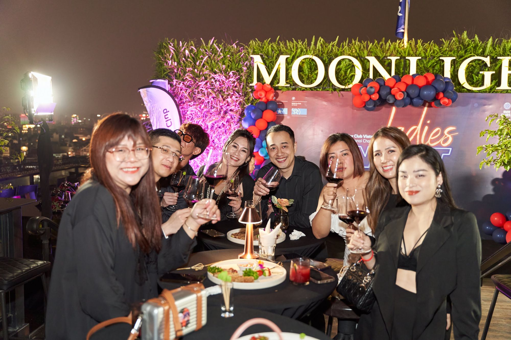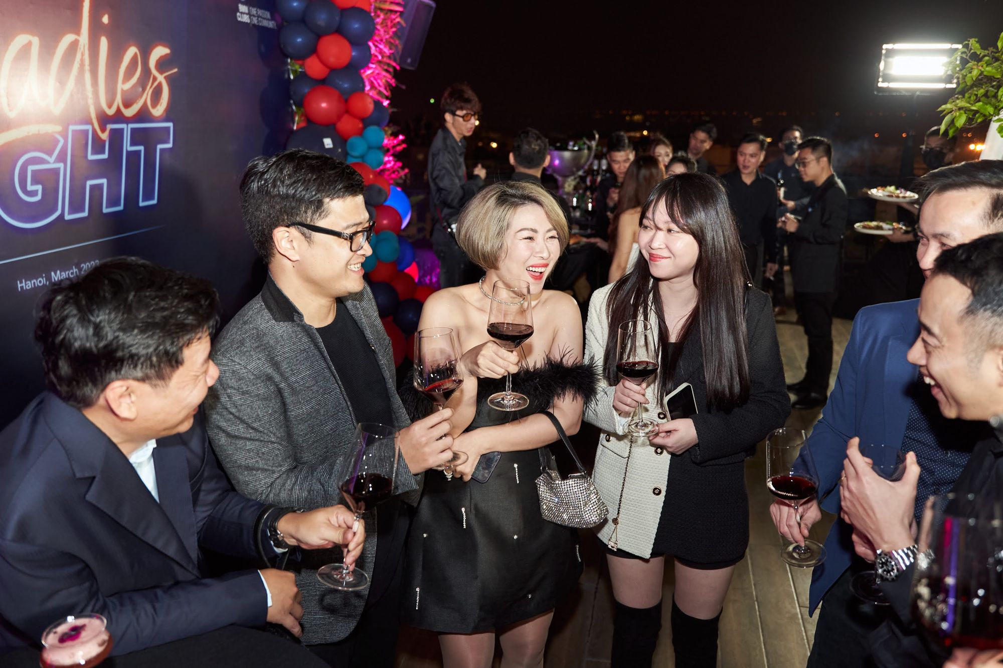 Buổi tiệc diễn ra tại Moonlight sky bar, tọa lạc trên nóc của khách sạn La Sieta với sự tham gia của gần 40 thành viên CLB, chiếm hơn 1/3 là nữ. Các chị em tới dự với những bộ cánh lộng lẫy và nổi bật, Còn cánh đàn ông thì nhìn nhau gượng gạo trong trang phục “quá lịch sự”. Để sự kiện diễn ra trọn vẹn, BTC đã quyết định thuê riêng tầng roof tại đây để các khách tới dự được tận hưởng một tối vô cùng tuyệt vời. Dưới ánh đèn sân khấu rực rỡ, những ly rượu vang đượm nồng khiến bầu không khí vô cùng sôi động giữa trời xuân Hà Nội.