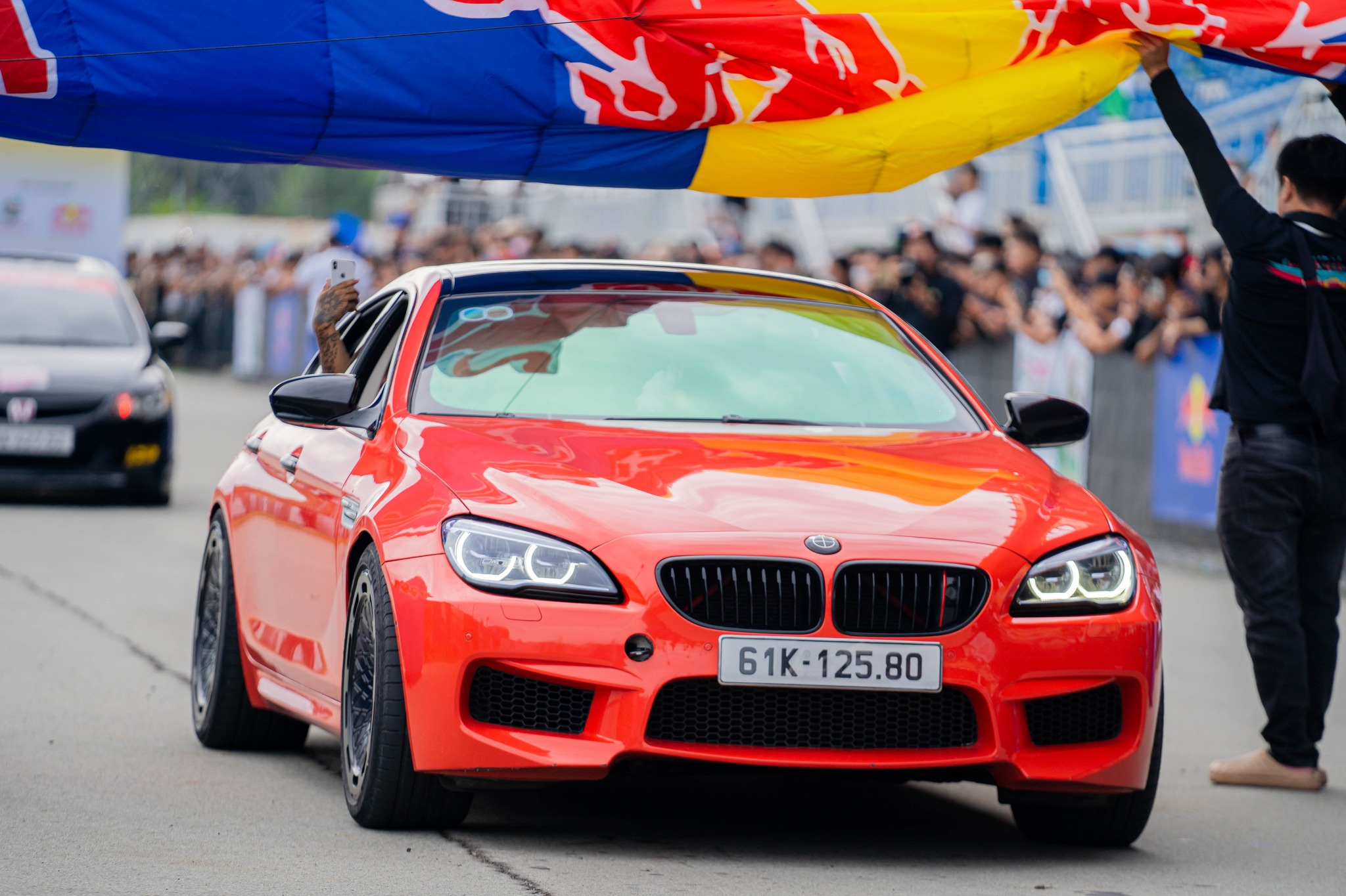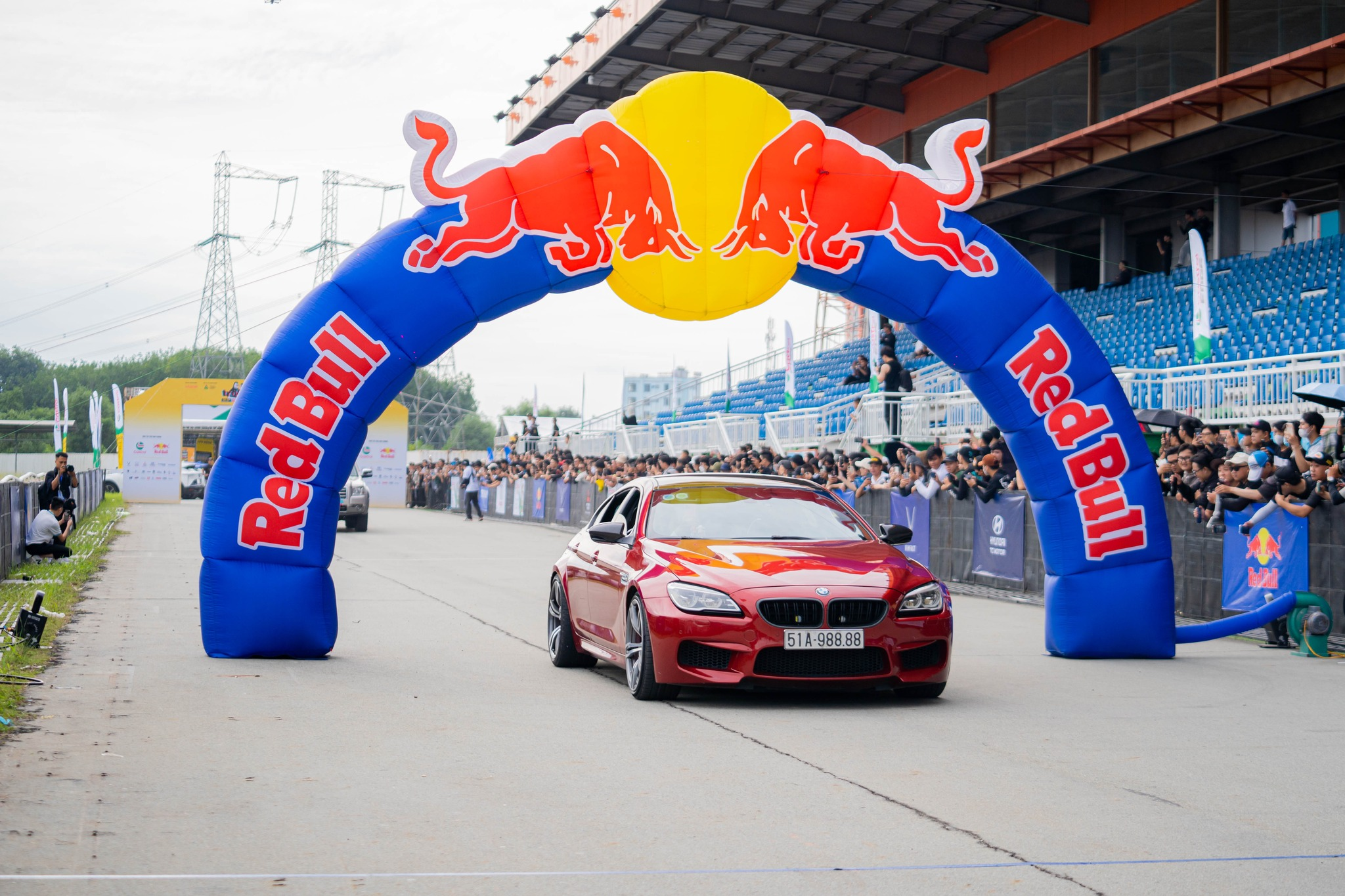 Hàng ngàn người tập trung để đi qua cánh cổng có logo RED BULL.