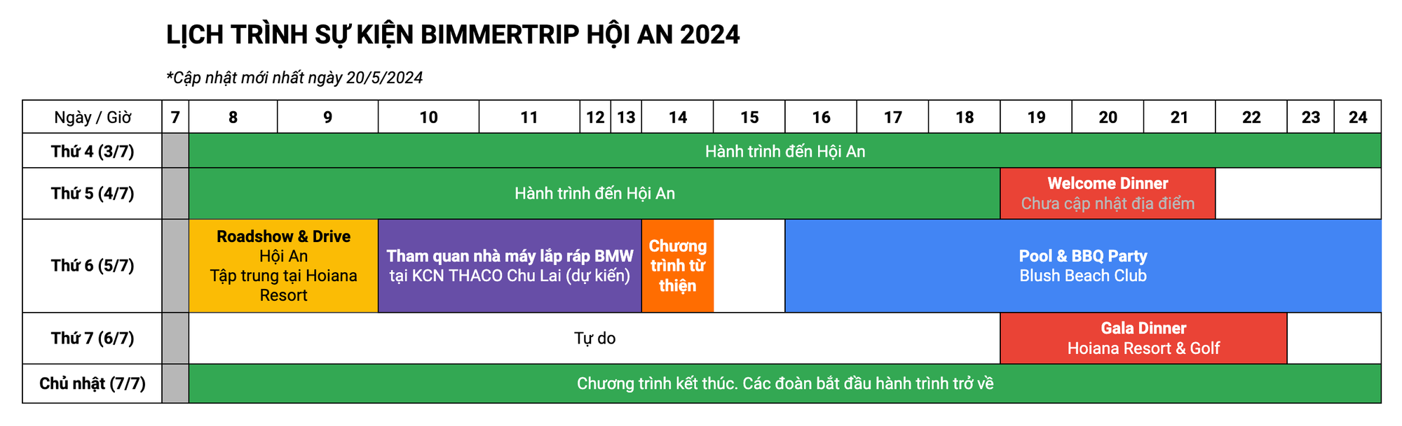 - Thứ 6 (ngày 5/7): chương trình roadshow tại Hội An, tham quan nhà máy lắp ráp BMW tại THACO Chu Lai (dự kiến), chương trình từ thiện tại Quảng Nam và chương trình Pool & BBQ Party (buổi chiều & tối)