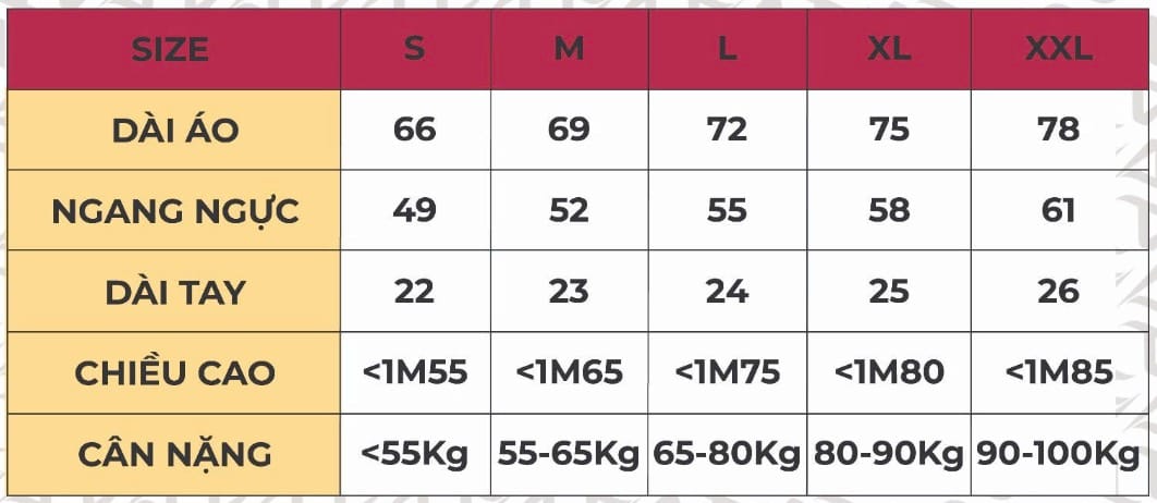 Bảng size áo Sự kiện: